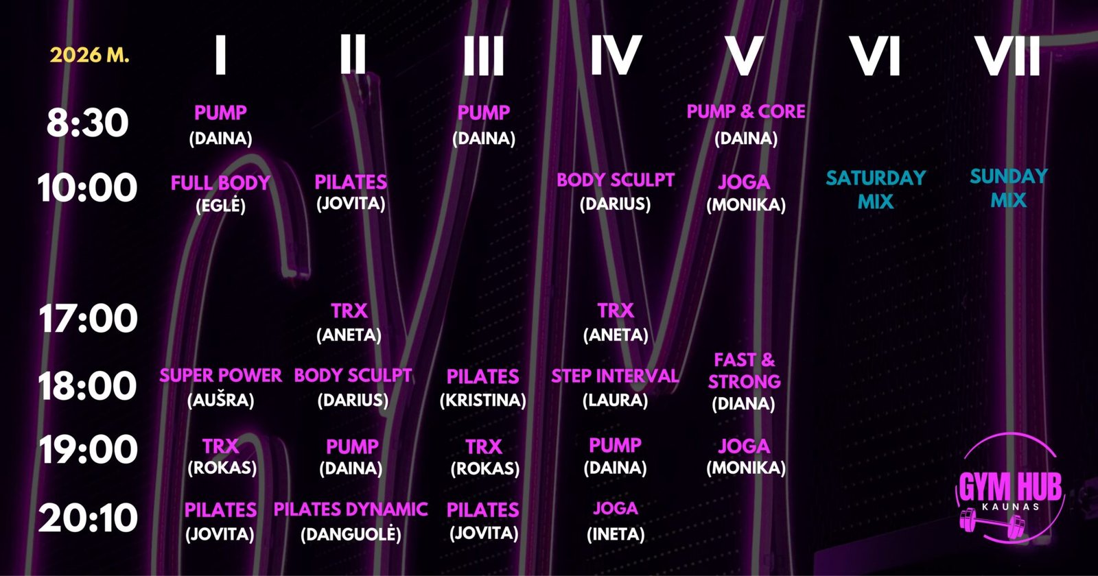 SVARBU: Esant grupinių treniruočių pakeitimams ar atšaukimams, lankytojai apie tai bus informuoti sporto klubo „GYM HUB“ socialinių tinklų („Facebook“ arba „Instagram“) „Story“ įrašuose.